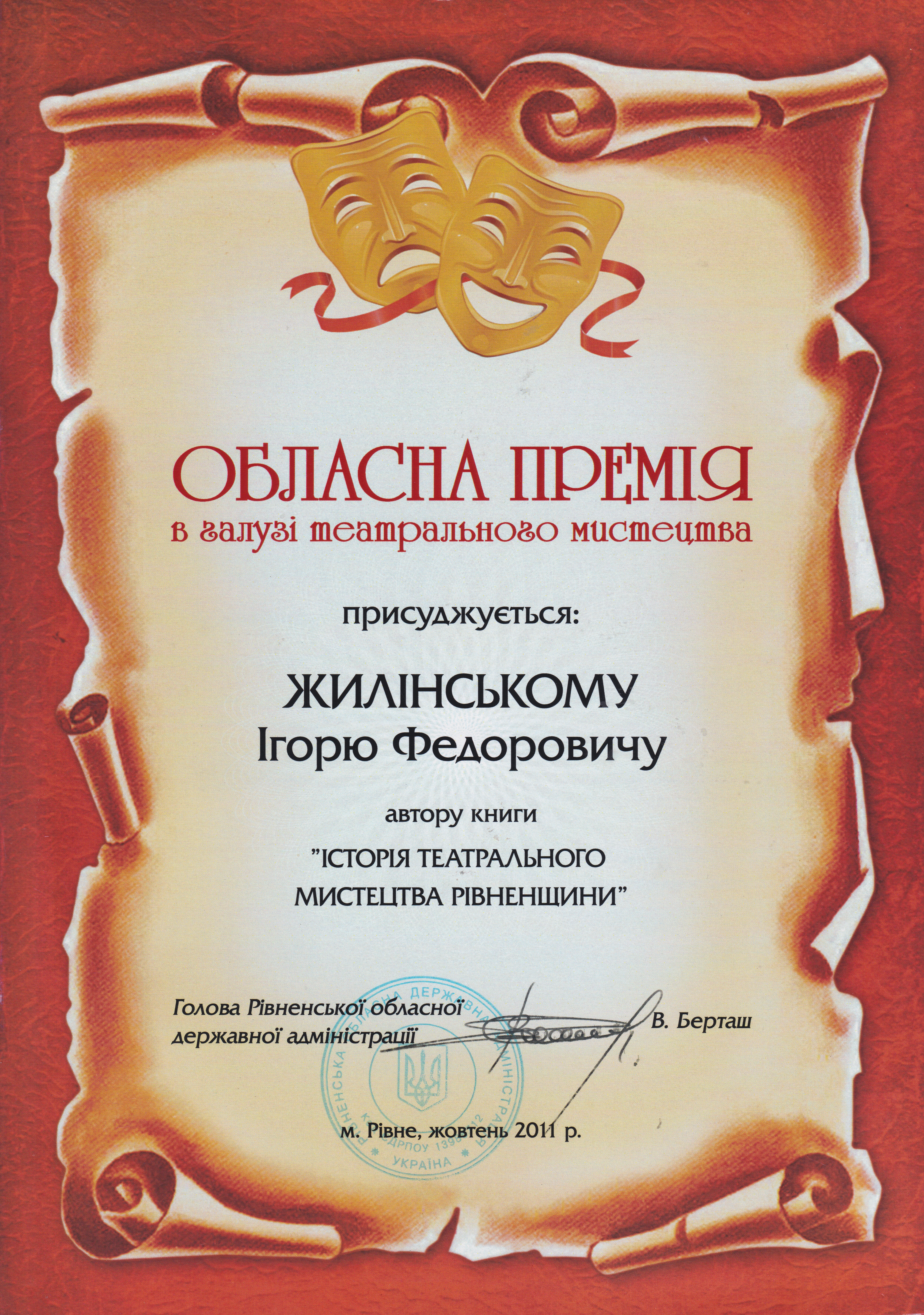 Обласна премія в галузі театрального мистецтва за книгу «Історія театрального мистецтва Рівненщини», 2011 рік -