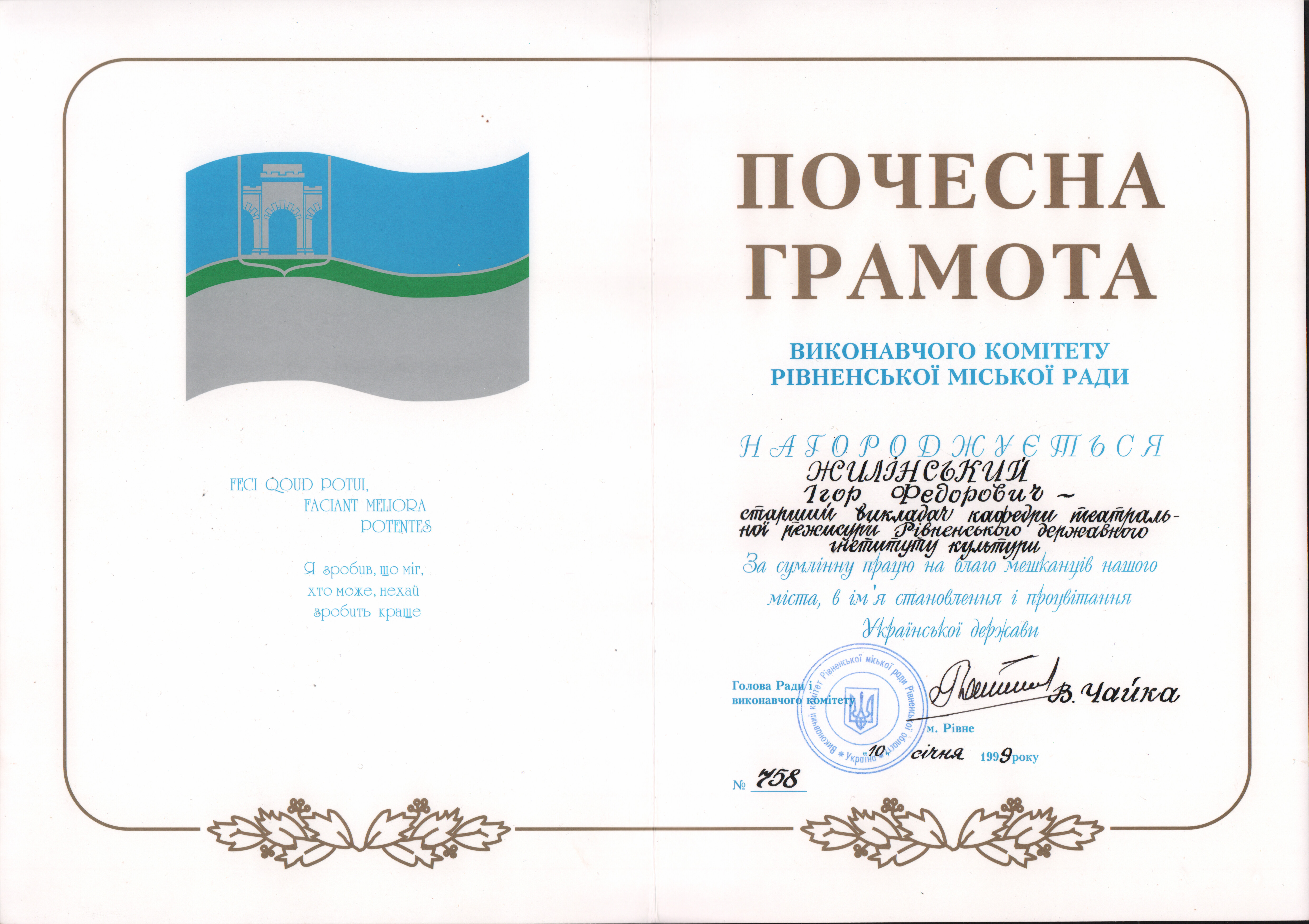 Почесна грамота Ігорю Жилінському за сумлінну працю на благо міста Рівне, від виконавчого комітету Рівненської міської ради -