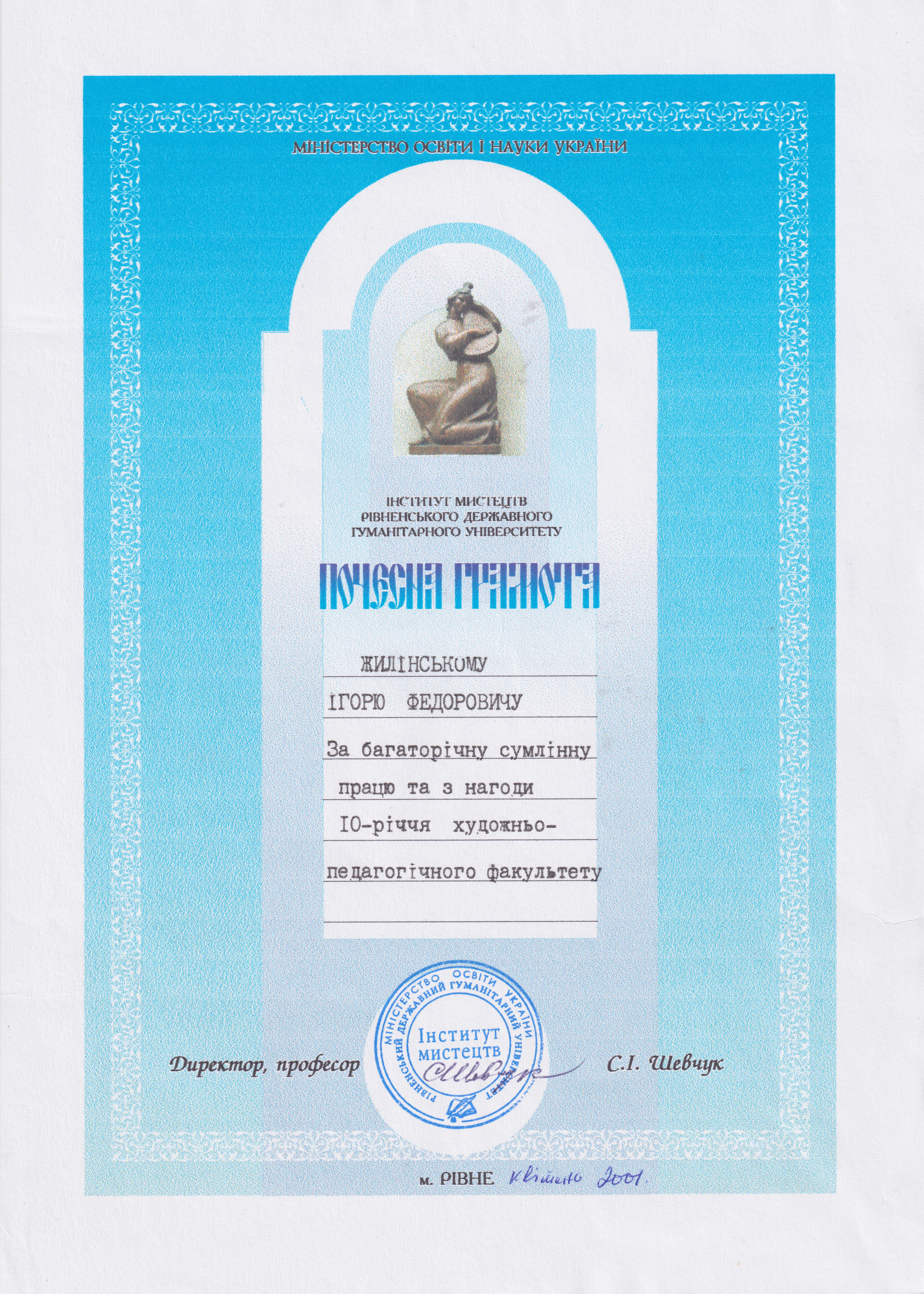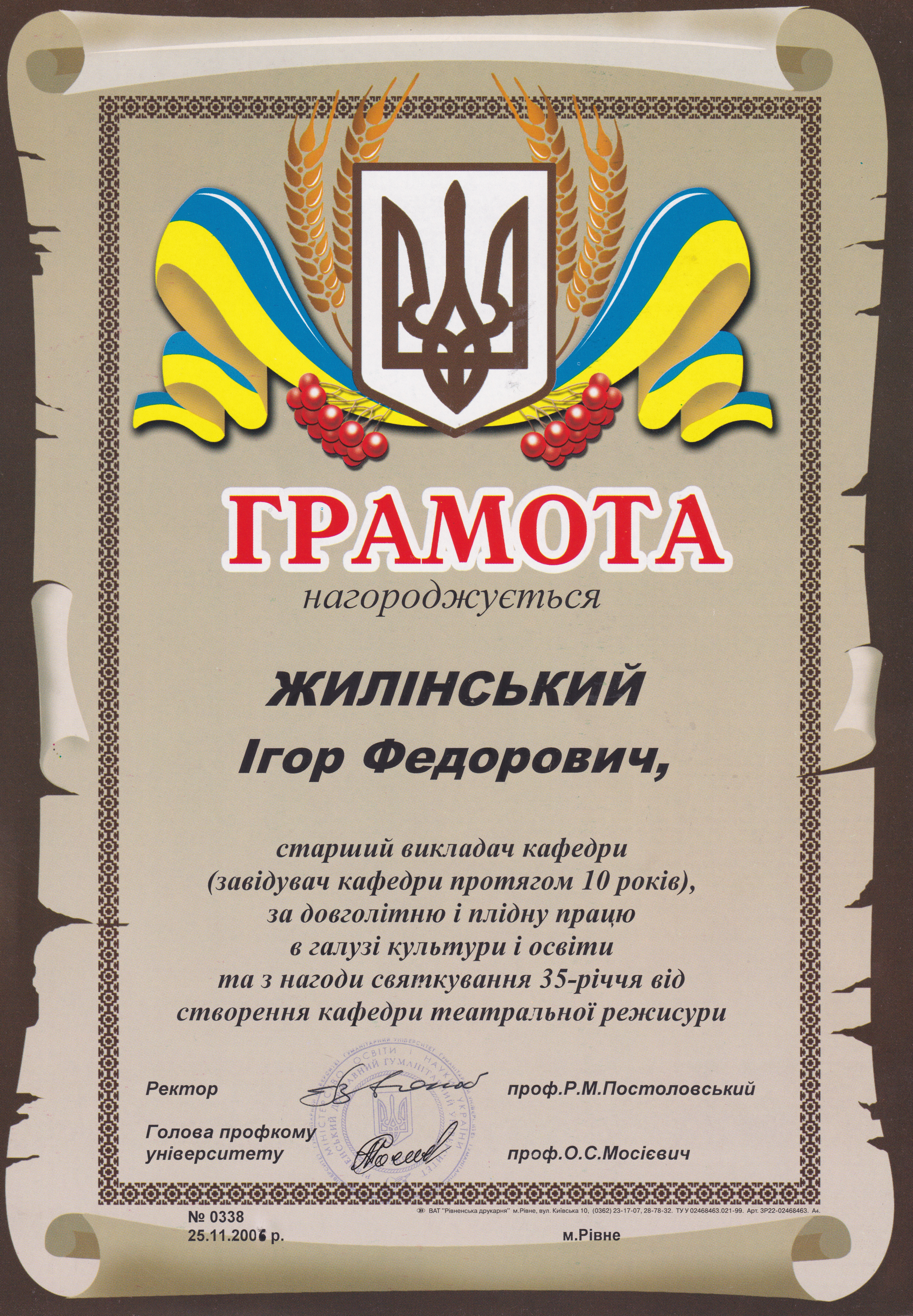 Грамота Жилінському (який був завідувачем кафедри протягом 10-ти років) за довголітню і плідну працю в галузі культури і освіти та з нагоди св'яткування 35-річчя від створення кафедри театрального мистецтва -