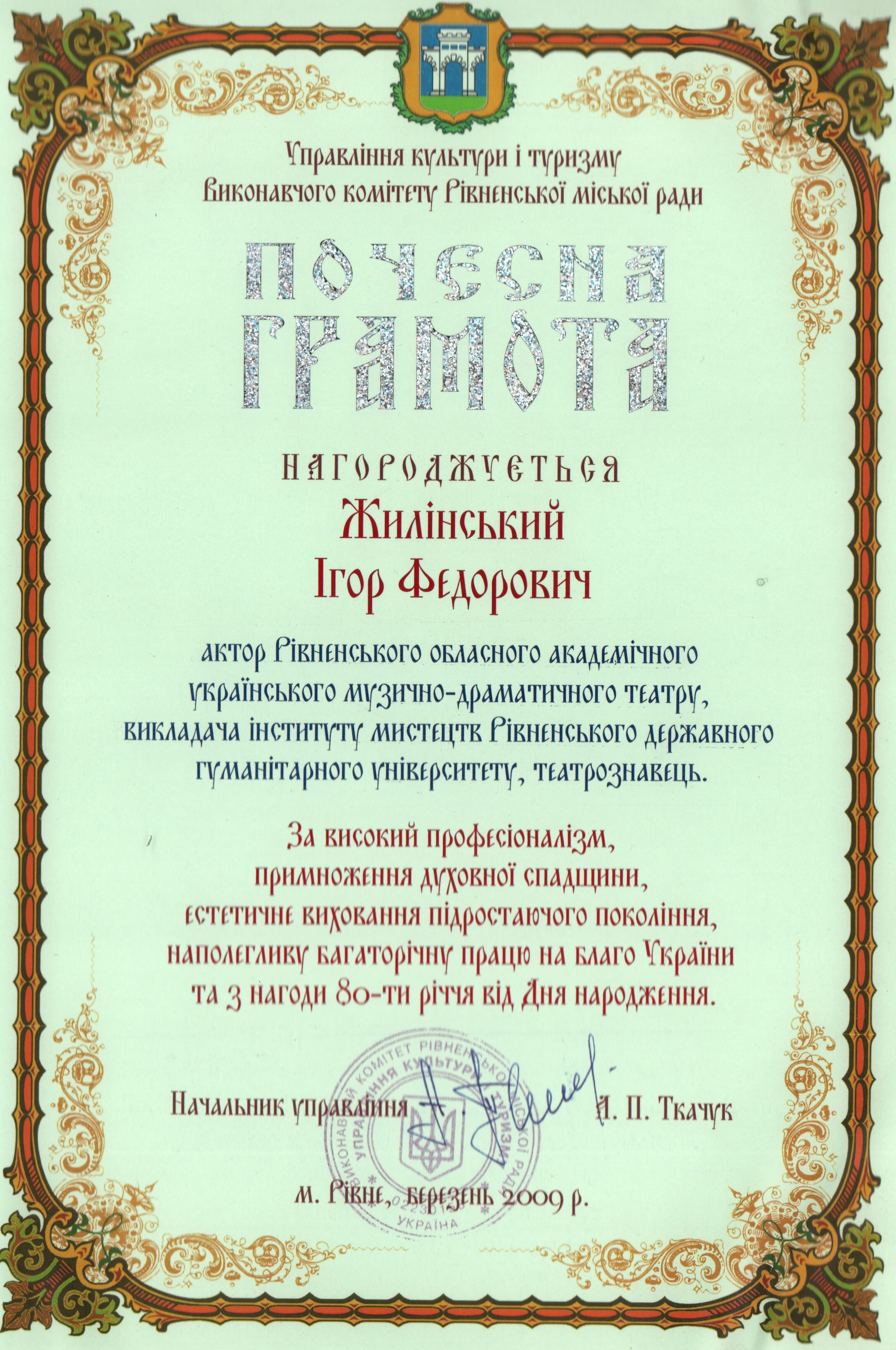 Почесна грамота Ігорю Жилінському за високий професіоналізм, примноження духовної спадщини, та з нагоди 80-тиріччя від дня народження -