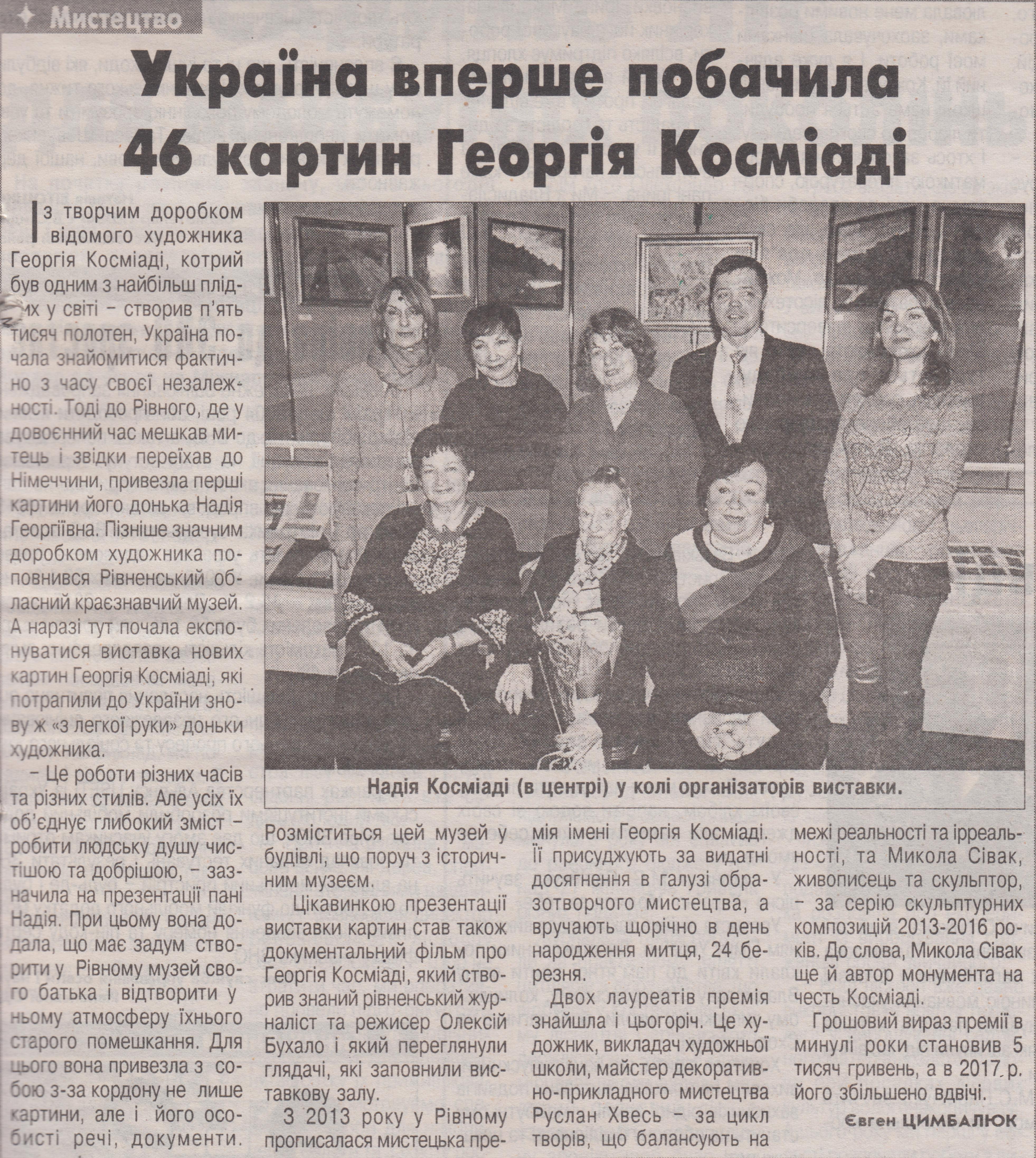 29. Цимбалюк Є. Україна вперше побачила 46 картин Георгія Косміаді / Є. Цимбалюк // Вільне слово. – 2017. – 30 берез. – С. 3. Микола Сівак отримав премію імені Георгія Косміаді за серію скульптурних композицій 2013–2016 рр.